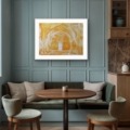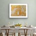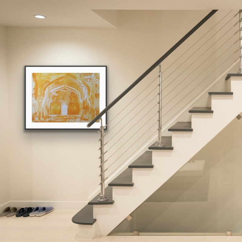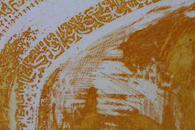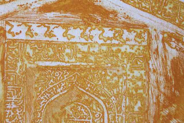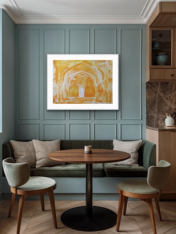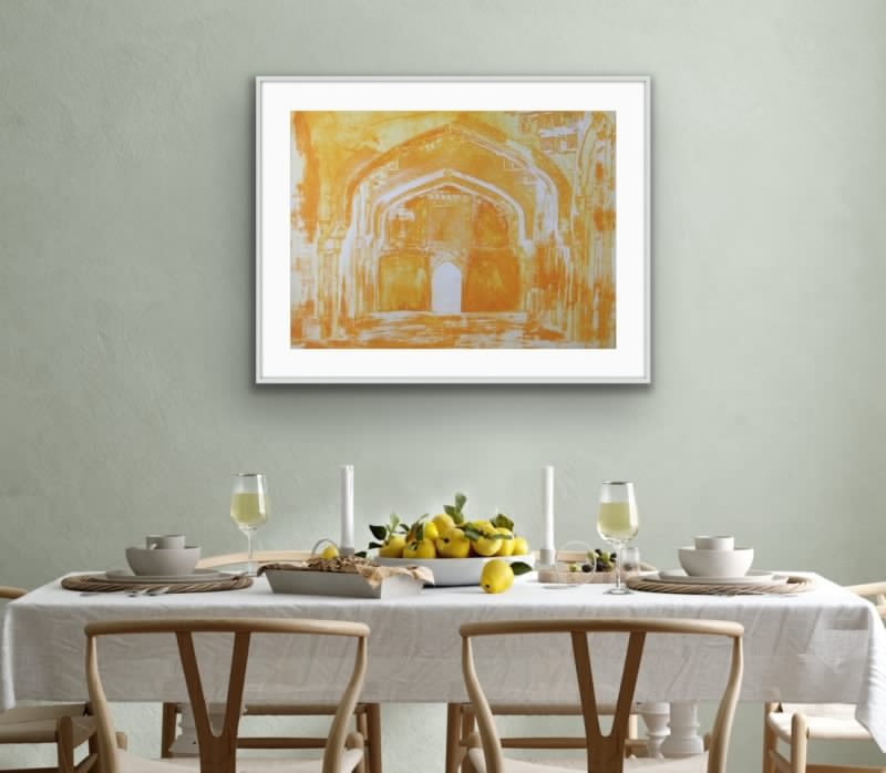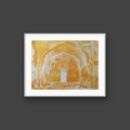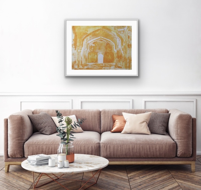 A warm and welcoming image reflected not only by the subject – The Mosque, but also by the palette of earthy, grounding yellow. There are intricate, crumbling etched details of Islamic script on the domed ceiling and washes of open bite on the pillars. There is sharp contrast of brilliant daylight beyond.