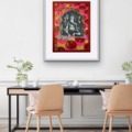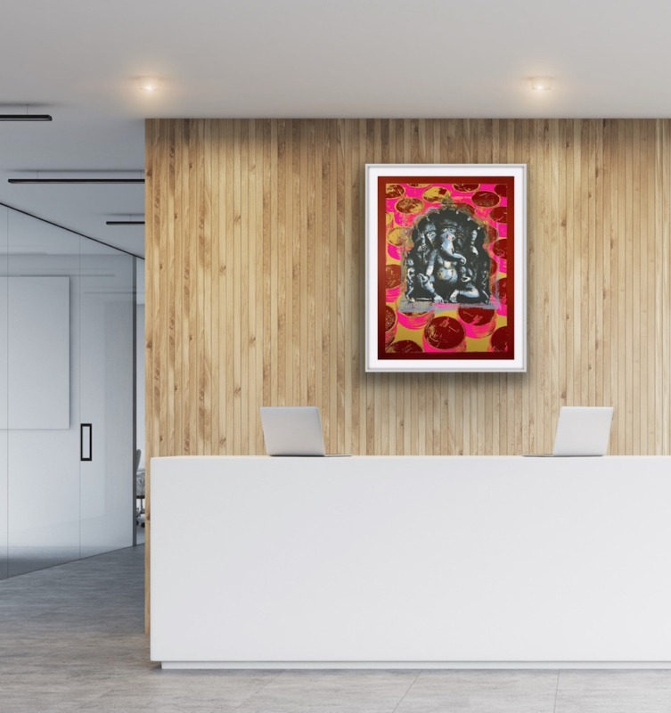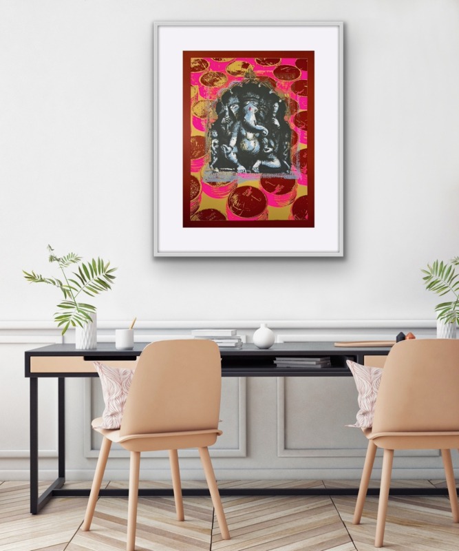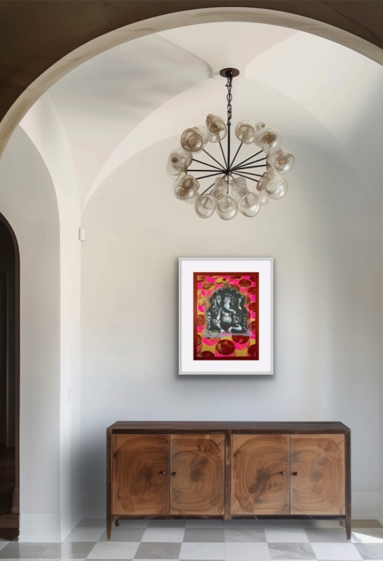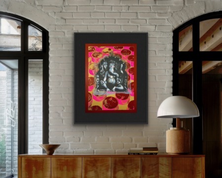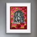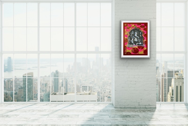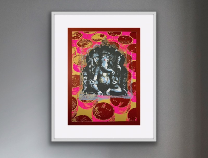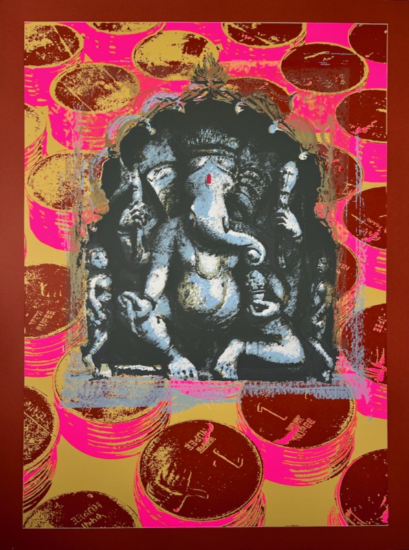 The Ganesha series plays with the god’s different aspects. In the Pink Rupees Series, the rupees of the background are hopeful offerings by devotees, or Ganesha’s promise of success: the viewer must decide.