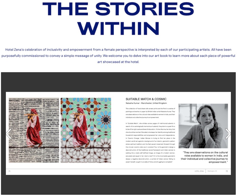 Hotel Zena is part hotel and part art gallery focused on works that celebrate women. Its powerful art collection simply titled “Her” features an array of pieces created by DC and UK artists, from a mural of late Supreme Court Justice Ruth Bader Ginsburg to a sequined “gown” layered in 8,000 protest buttons supporting the fight for Women’s Rights.