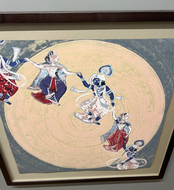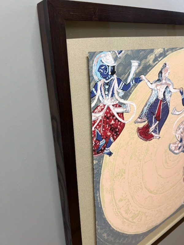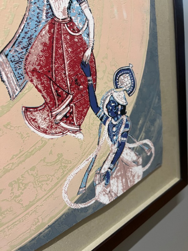 Through a subtle combination of etching and screenprint that references architectural motifs of the chhatri, and pictorial traditions of the dance Kumar allows the viewer to share the gopi’s ethereal experience of the Rasa Lila. Each gopi feels that she dances with Krishna alone, the focus of his attention. But taken as a whole, the work catches a glimpse of how Krishna reproduced himself a thousand times over to dance with every gopi simultaneously. Natasha Kumar’s Rasa Lila is a striking contemporary reinterpretation of a classical Hindu story.