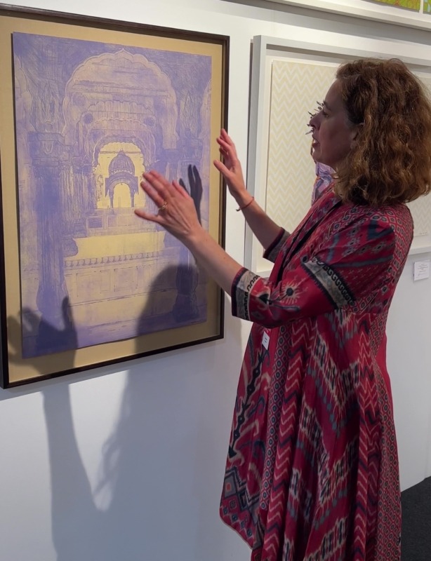 The abstraction of shape and choice of colour is important; in particular The Royal Chhatris Series began after numerous return trips to capture these monumental canopied wonders by using drypoint and etching. She wanted to capture the architectural space and perspective, the onion domes and the decorative pillars, but the latest series is an exciting mix and balance of colour offset against colour. Her palette lay bravely. Here there are significant sensual reds, the purity of blue, and the representation of life and happiness in green.
