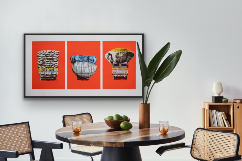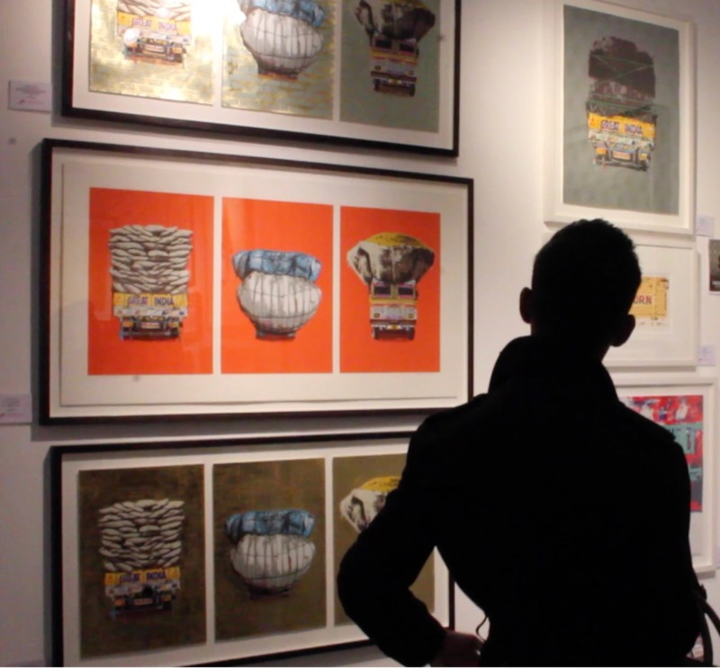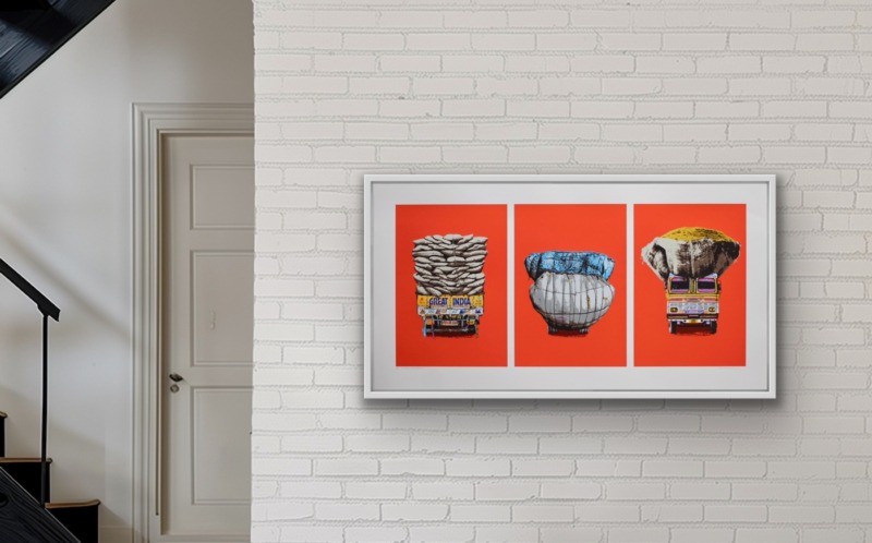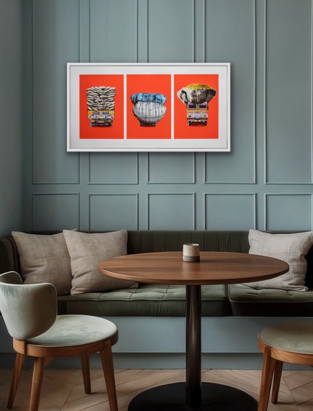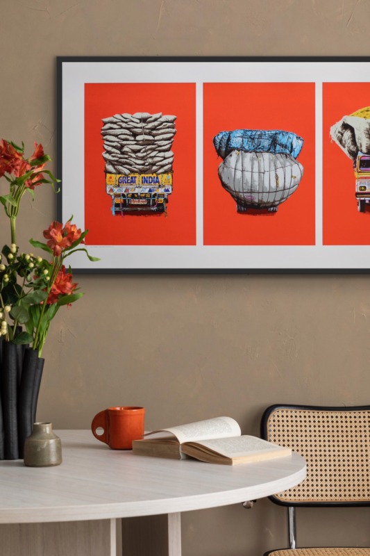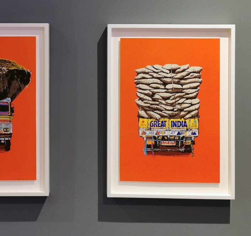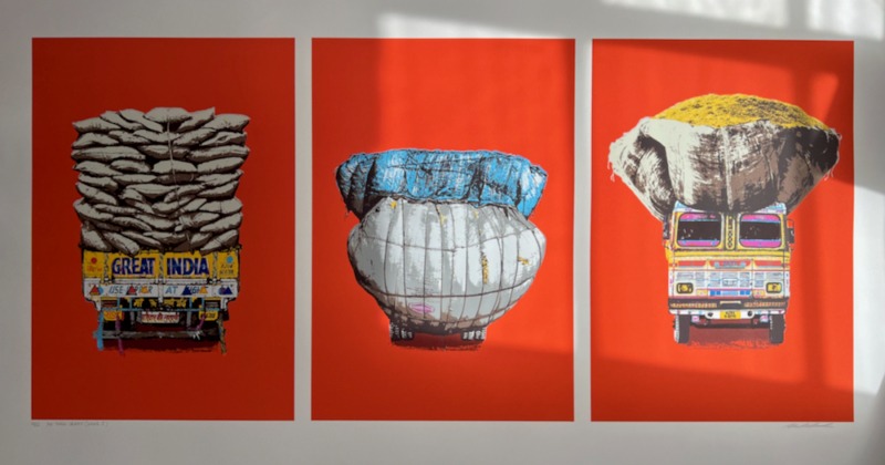Love of colour and street life lie behind her recent decision to create a triptych of lorry portraits. Not an obvious choice of subject matter at first, you might think. But in India every flat surface is a potential canvas, she says. If it stays still long enough to be painted on, it will be, with a mesmerising mix of folk art and cultural messaging. Lorries are the plus-size epitome of that, a visual cacophony in technicolour trundling across the subcontinent.