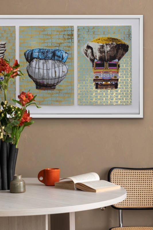 Love of colour and street life lie behind her recent decision to create a triptych of lorry portraits. Not an obvious choice of subject matter at first, you might think. But in India every flat surface is a potential canvas, she says. If it stays still long enough to be painted on, it will be, with a mesmerising mix of folk art and cultural messaging. Lorries are the plus-size epitome of that, a visual cacophony in technicolour trundling across the subcontinent.