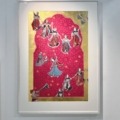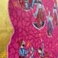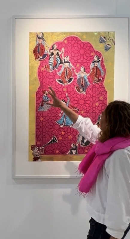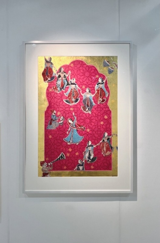The drummers represent the beat of the heart, and the heart beats the rhythm of everyday life. The dancing women, hand in hand, capture a universal joyful human experience. The infinite geometric design is a signature Kumar motif, referencing the timeless nature of the dance, a microcosm against the macrocosm.
